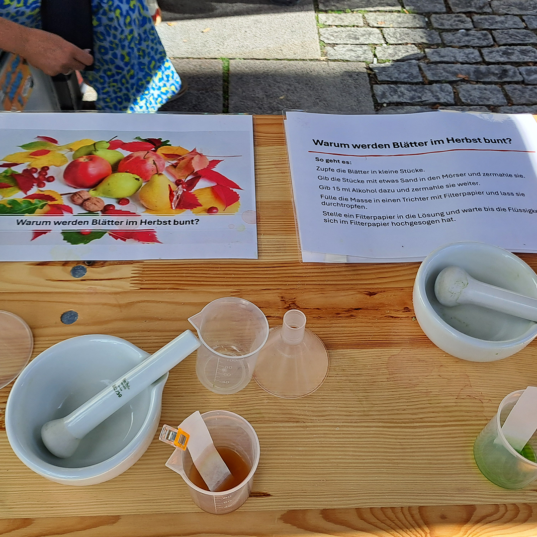 Bioexperimente: „Warum werden im Herbst die Blätter bunt?“ – Extraktion von Blattfarbstoffen, um sichtbar zu machen, welche Pigmente (Chlorophyll, Carotinoide etc.) beim Grün verblassen und wie sich die Farben verändern und was chemisch dahinter steckt.