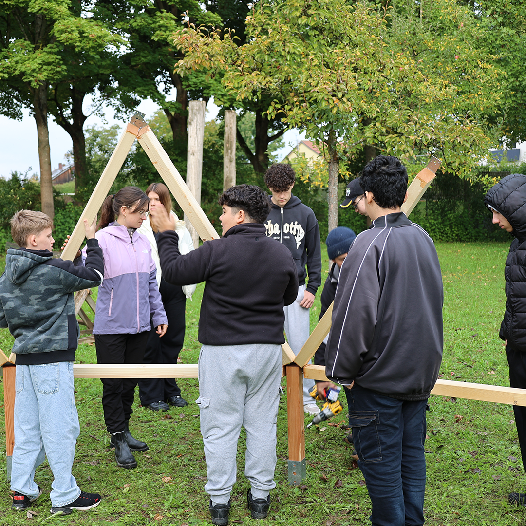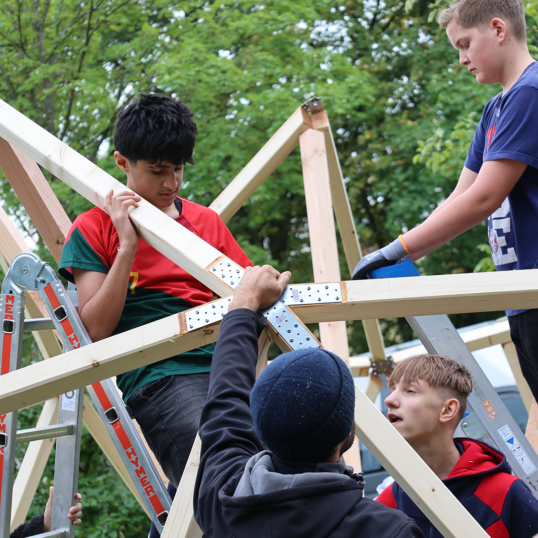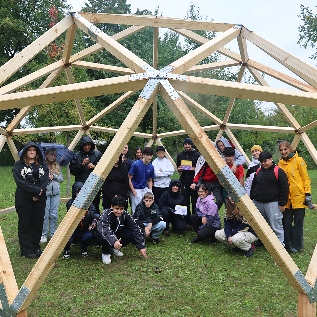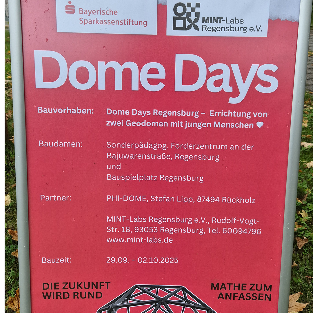 Vom 29. September bis 2. Oktober 2025 fanden die Dome Days statt, organisiert von den MINT-Labs Regensburg und in Zusammenarbeit mit dem Lern-Raum-Gestalter und Zimmermann Stefan Lipp aus dem Allgäu. Insgesamt 39 Kinder aus dem Sonderpädagogischen Förderzentrum Bajuwarenstraße, der Pestalozzi-Mittelschule („Draußenklasse“) und aus den MINT-Labs arbeiteten gemeinsam an zwei GeoDomes – stabilen Kuppelbauten aus Holz, die als Lernorte für Mathematik, Technik und Handwerk auch in Zukunft dienen werden.