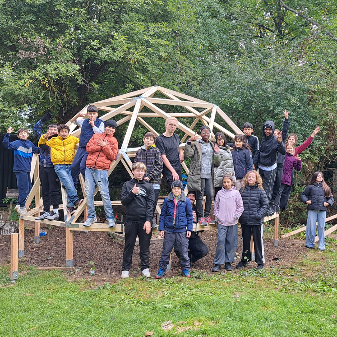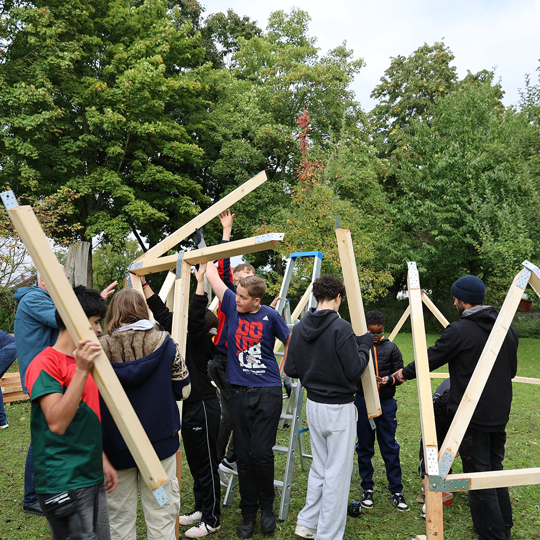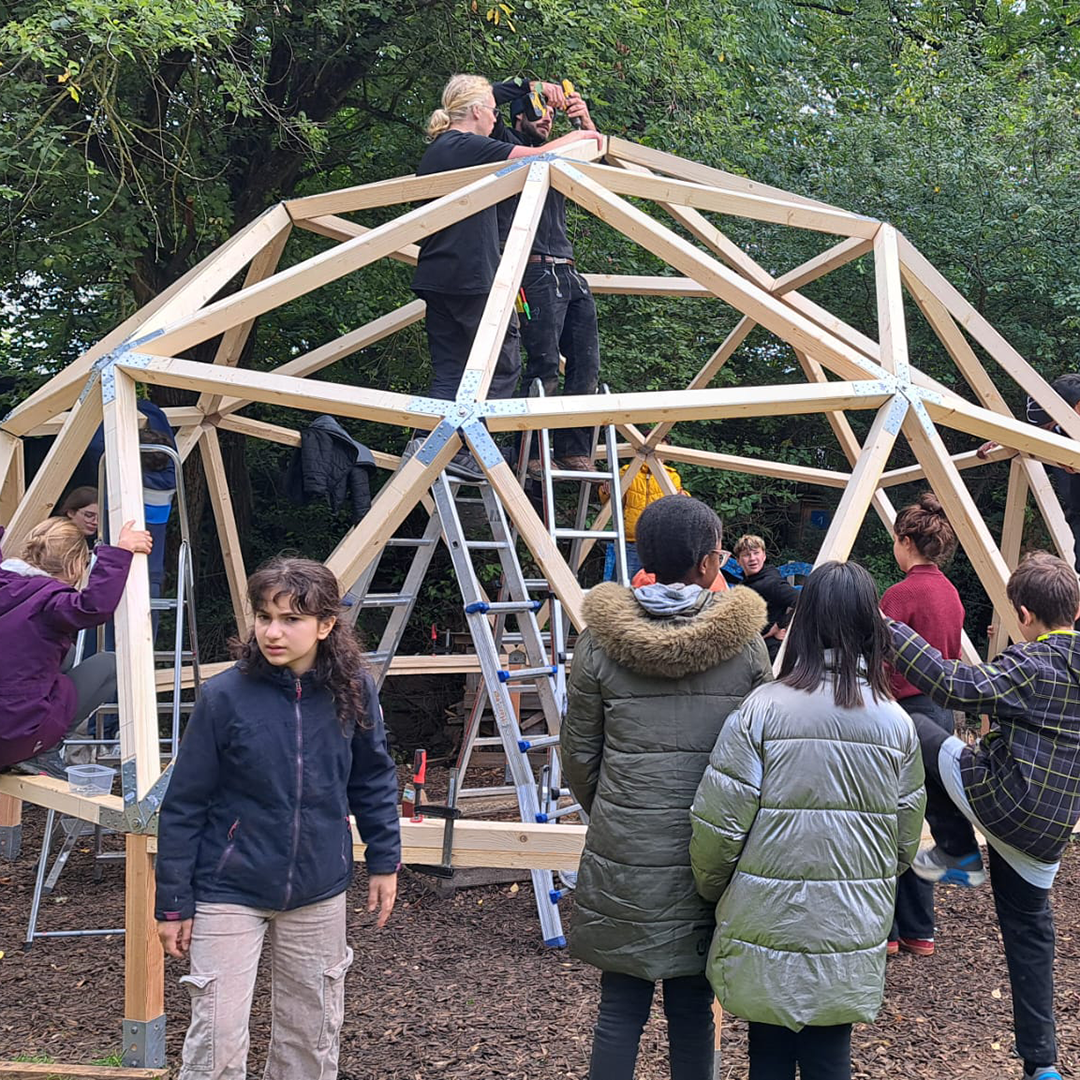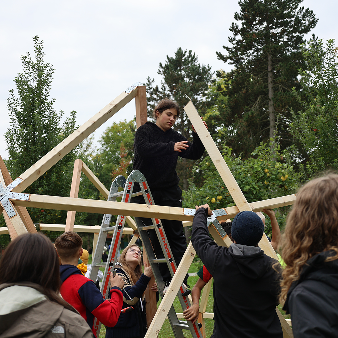 Vom 29. September bis 2. Oktober 2025 fanden die Dome Days statt, organisiert von den MINT-Labs Regensburg und in Zusammenarbeit mit dem Lern-Raum-Gestalter und Zimmermann Stefan Lipp aus dem Allgäu. Insgesamt 39 Kinder aus dem Sonderpädagogischen Förderzentrum Bajuwarenstraße, der Pestalozzi-Mittelschule („Draußenklasse“) und aus den MINT-Labs arbeiteten gemeinsam an zwei GeoDomes – stabilen Kuppelbauten aus Holz, die als Lernorte für Mathematik, Technik und Handwerk auch in Zukunft dienen werden.