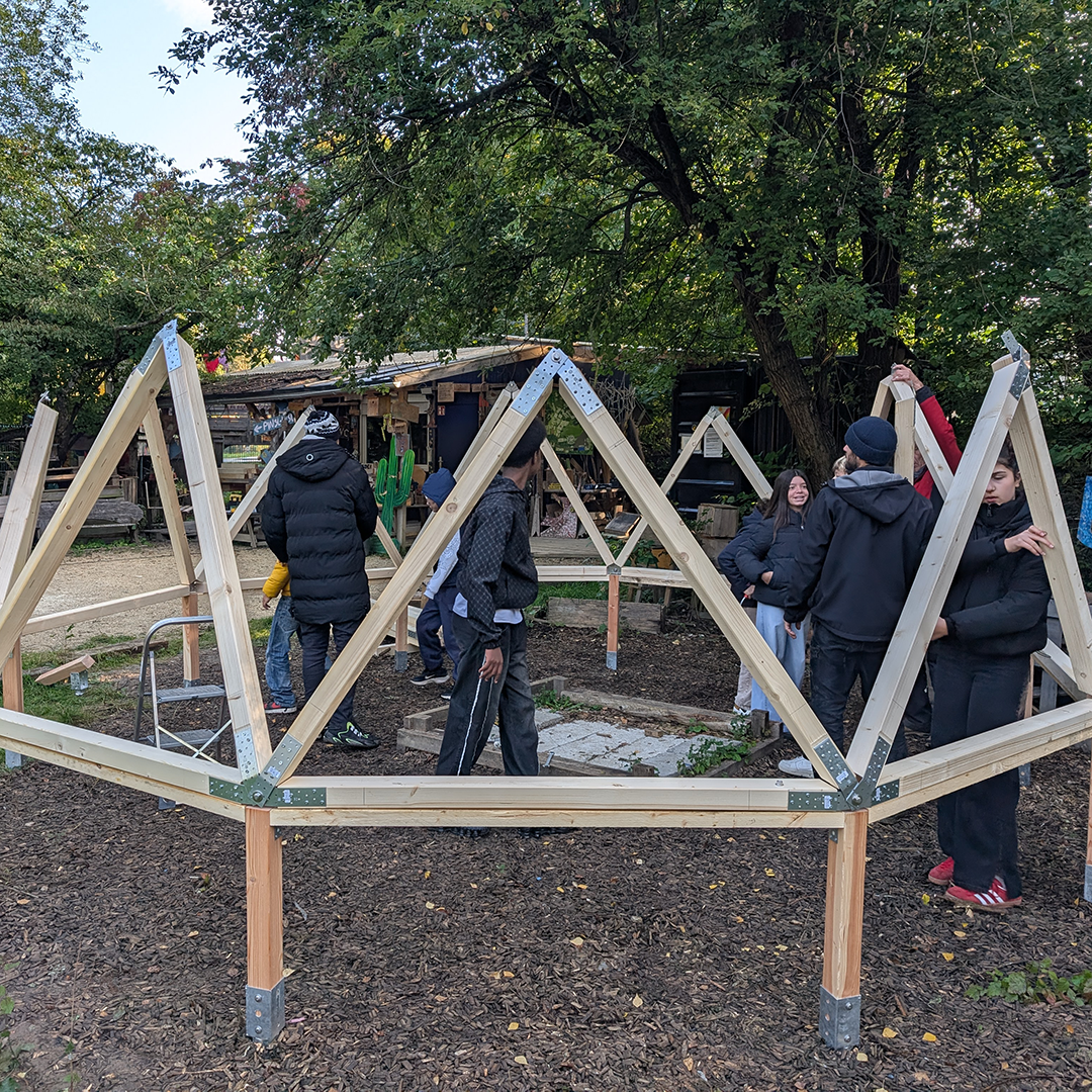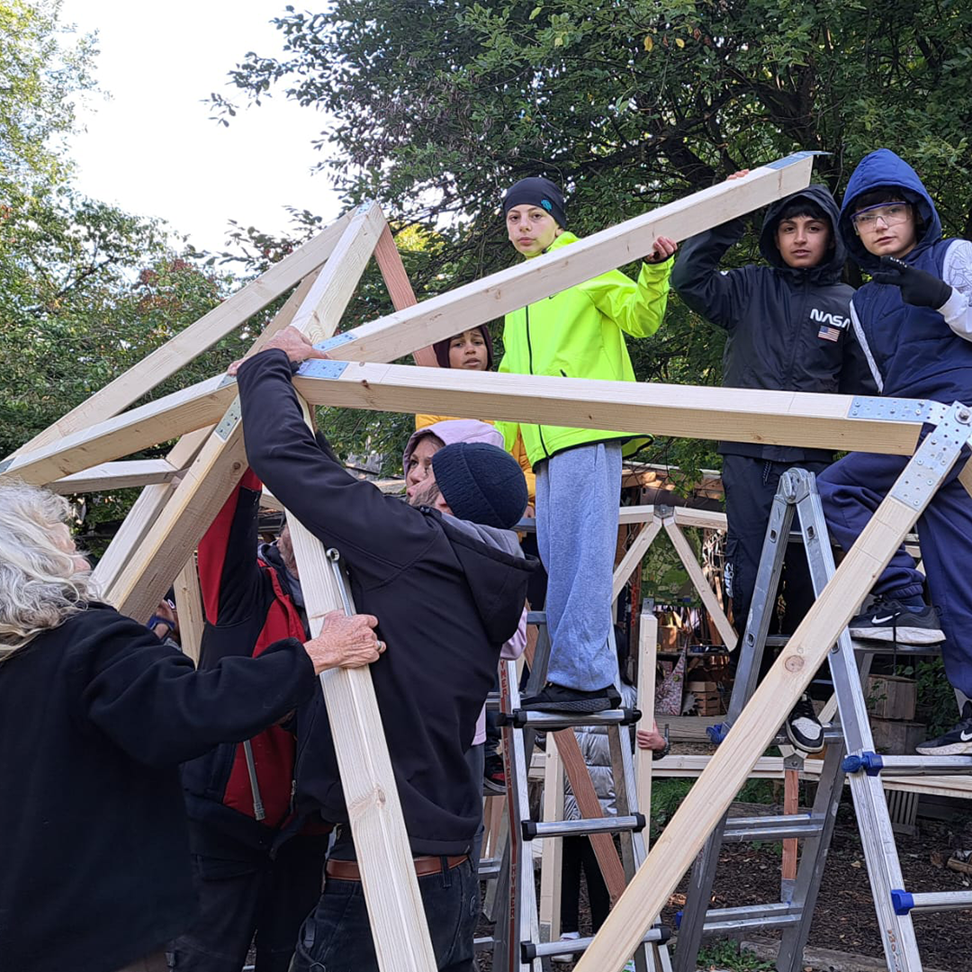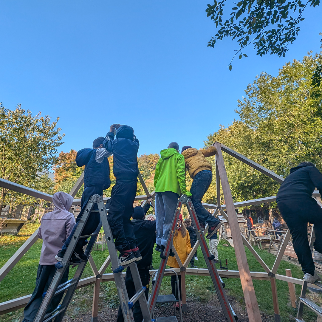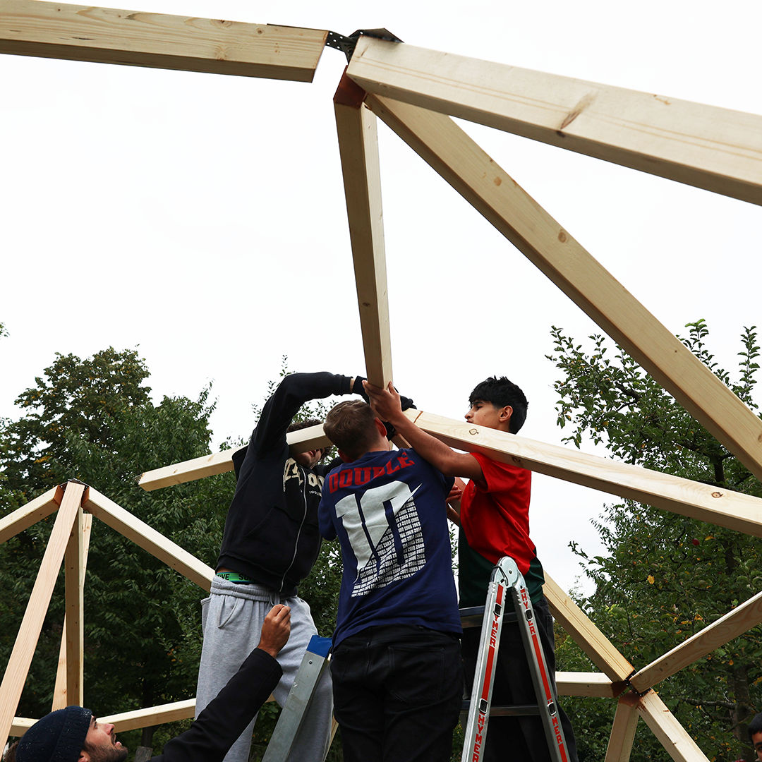 Vom 29. September bis 2. Oktober 2025 fanden die Dome Days statt, organisiert von den MINT-Labs Regensburg und in Zusammenarbeit mit dem Lern-Raum-Gestalter und Zimmermann Stefan Lipp aus dem Allgäu. Insgesamt 39 Kinder aus dem Sonderpädagogischen Förderzentrum Bajuwarenstraße, der Pestalozzi-Mittelschule („Draußenklasse“) und aus den MINT-Labs arbeiteten gemeinsam an zwei GeoDomes – stabilen Kuppelbauten aus Holz, die als Lernorte für Mathematik, Technik und Handwerk auch in Zukunft dienen werden.