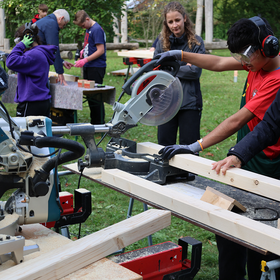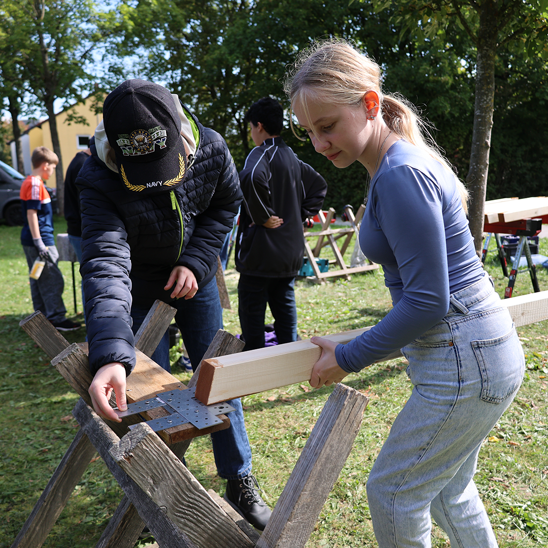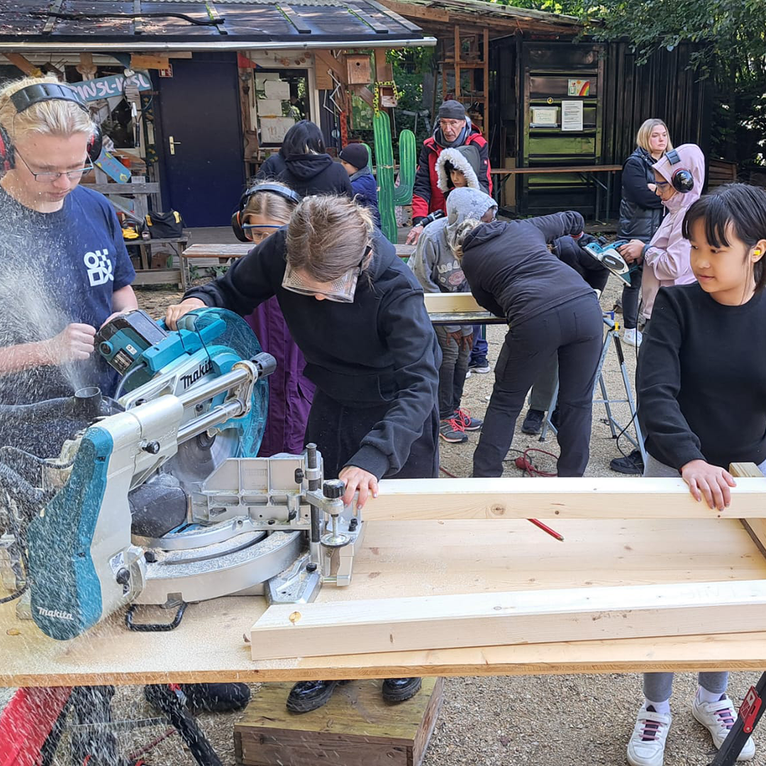 Die Kinder durchliefen verschiedene Stationen: Sägen, hobeln, anstreichen, verschrauben, biegen und Zusammenbau – immer begleitet von Sicherheitseinweisungen, Reflexion und Feedback. So lernten sie nicht nur den Umgang mit Werkzeugen, sondern auch Teamarbeit, Durchhaltevermögen und Eigenverantwortung.