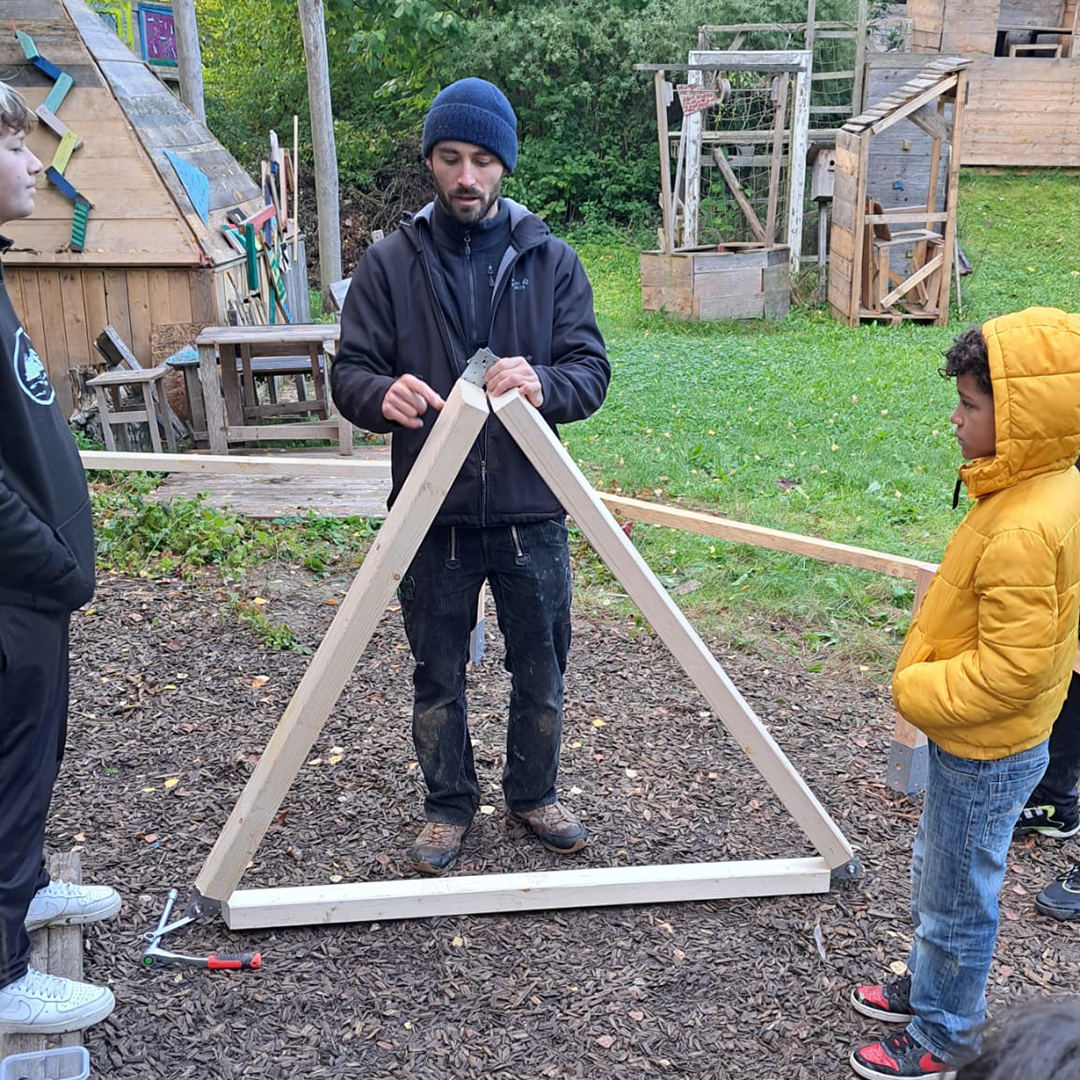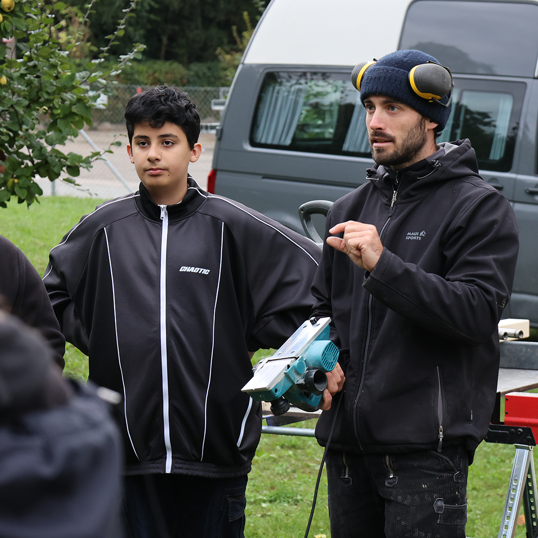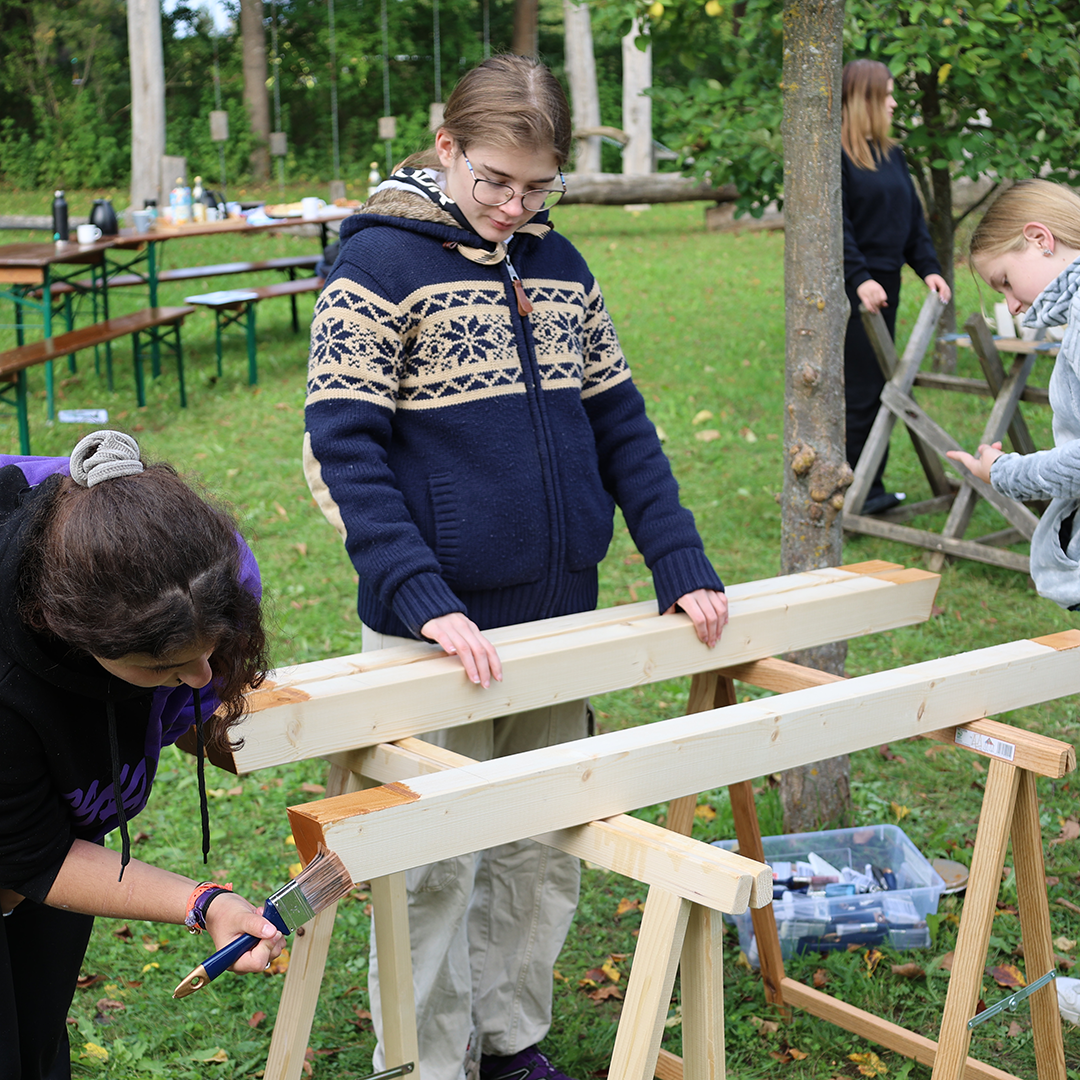 Die Kinder durchliefen verschiedene Stationen: Sägen, hobeln, anstreichen, verschrauben, biegen und Zusammenbau – immer begleitet von Sicherheitseinweisungen, Reflexion und Feedback. So lernten sie nicht nur den Umgang mit Werkzeugen, sondern auch Teamarbeit, Durchhaltevermögen und Eigenverantwortung.