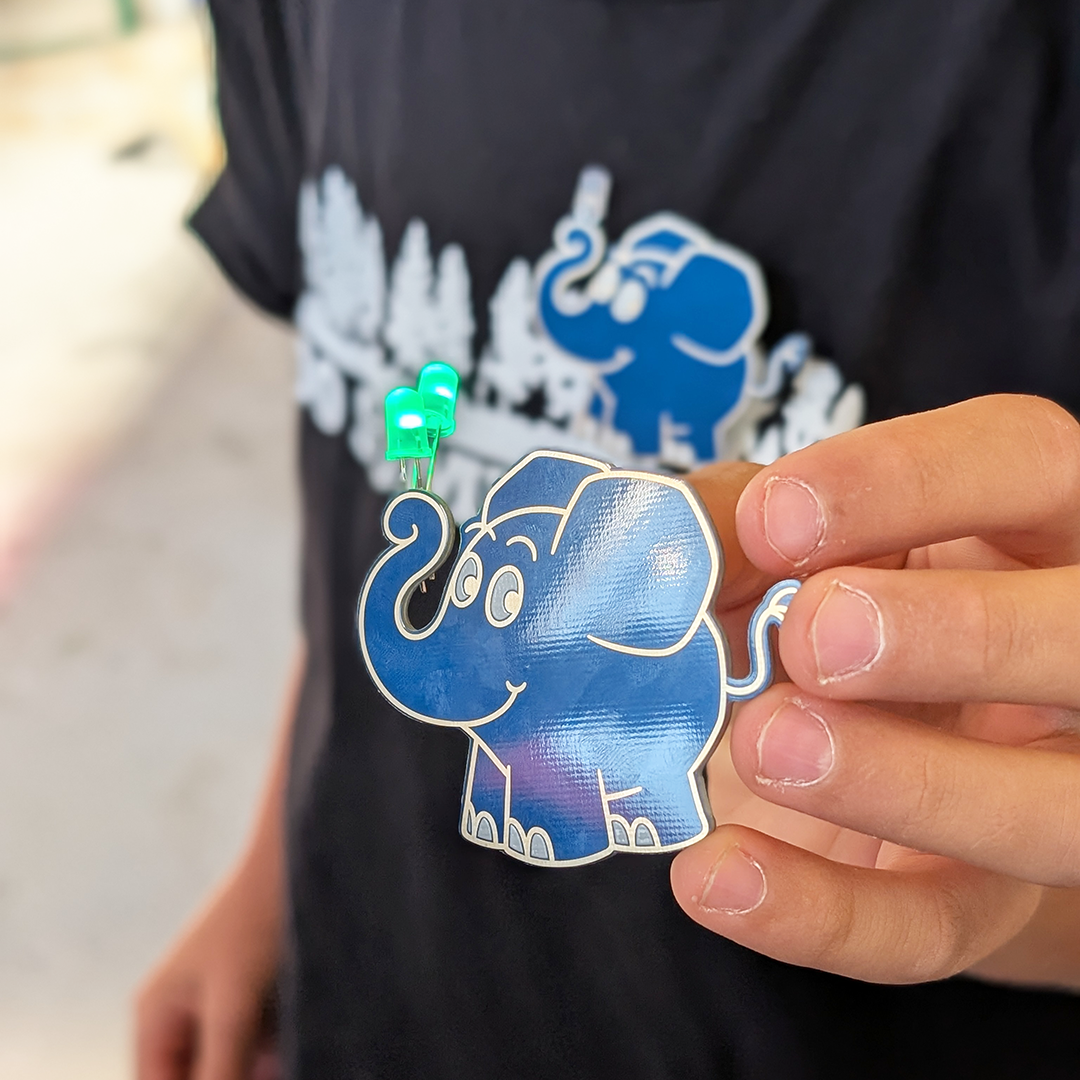 Elefant: LED-Anstecker: Ein liebevoll gestalteter Anstecker mit Farbwechsel-LED und Metall-Pin auf der Rückseite – ideal auch für jüngere Einsteiger:innen ins Löten.
